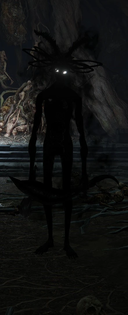 Cemetery Shades are shadowy, insect-ridden gravekeepers found in catacombs. They are lanky, long-necked humanoids with hollow torsos and large, glowing eyes. Each has a creature resembling a spider or a crab sitting atop their head, and they fight with pairs of curved blades.[1]