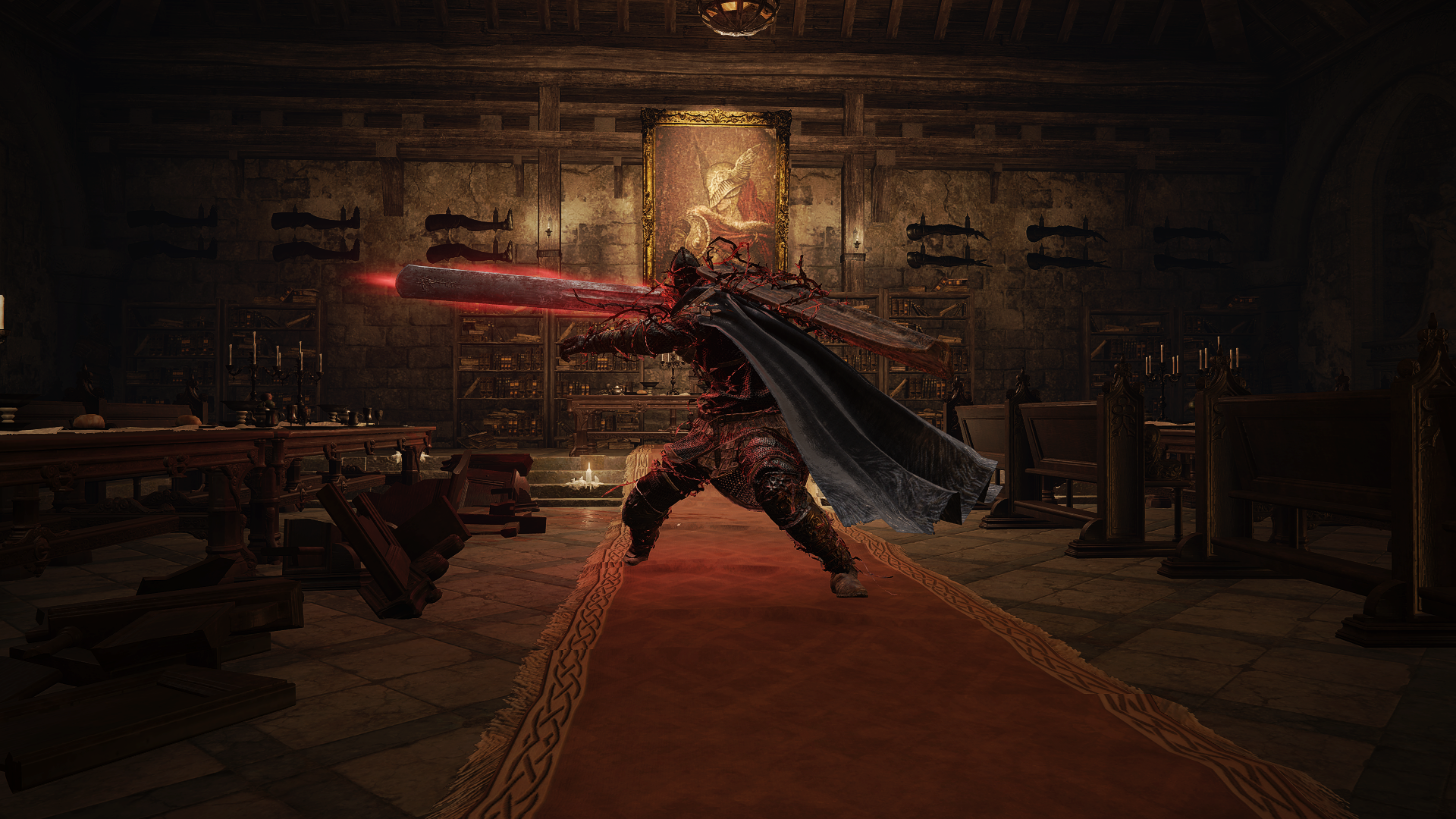 The first time he is encountered he will be facing the painting at the end of the room, making a heavy initial attack such as a charged heavy attack more possible. On subsequent attempts he will be facing the entrance.