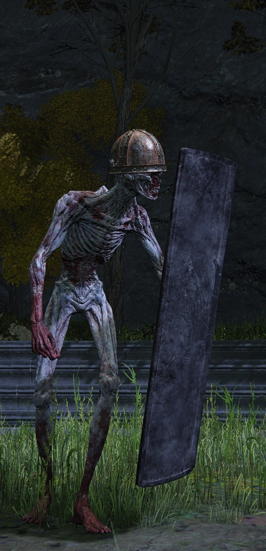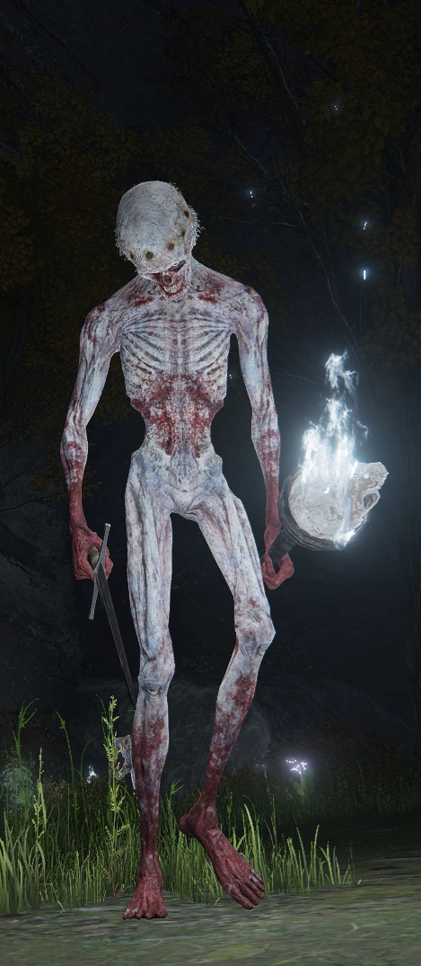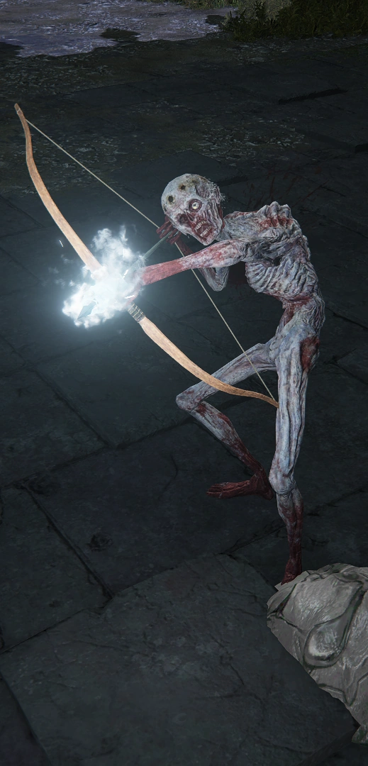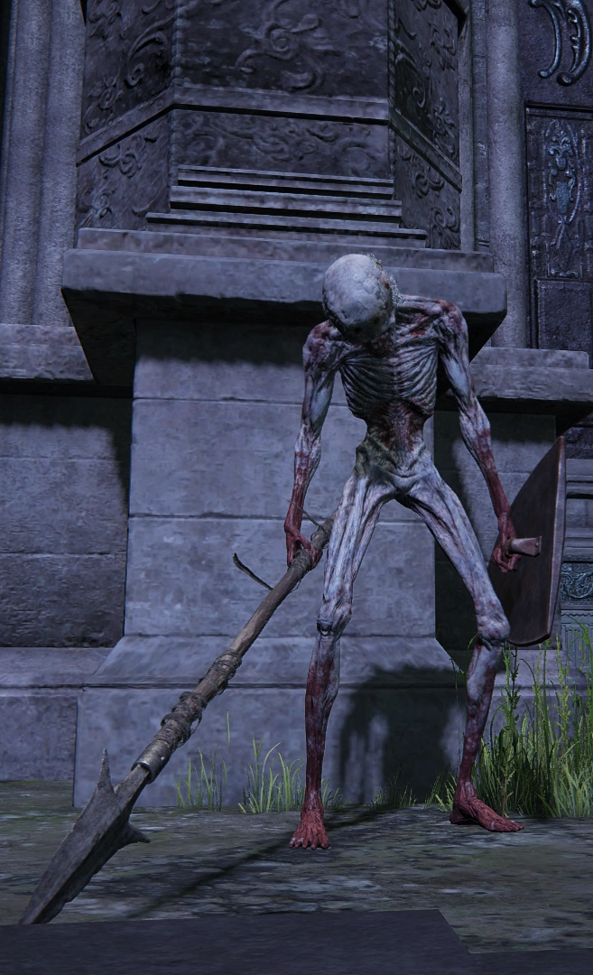 The soldiers are pale and skeletal in appearance, lacking armour aside from a few who wear crude helmets. They are missing eyes, and their noses have worn away. They appear to have holes drilled into their heads. The soldiers wield a variety of armaments, including spears, swords, greatshields, heater shields, ghostflame torches, and bows that fire arrows tipped with ghostflame. Their methods are somewhat crude, yet they work well together as a squadron.[4][5]