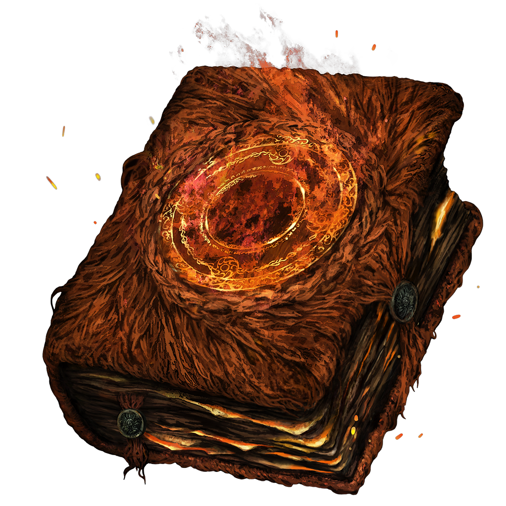 - The singed, smoldering pages of this prayerbook are bound in thick, red fur that swirls around a braided ring encircling a searing Giants' Flame crest. A verdigris clasp holds it tightly shut.