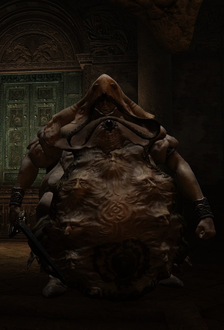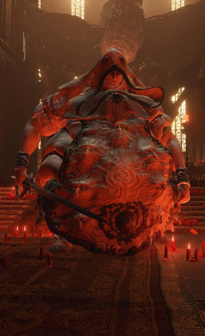 The Godskin Nobles are stout humanoids who wear robes sewn together from patches of soft skin, featuring seven-faced aprons. They are the most ancient of the apostles who once served the Gloam-Eyed Queen,[1] incorporating inhuman physiology, not unlike the primordial crucible.[2]They wield elegant thrusting swords with skill unmatched by lowborns,[3] and wield black flame like the Godskin Apostles.