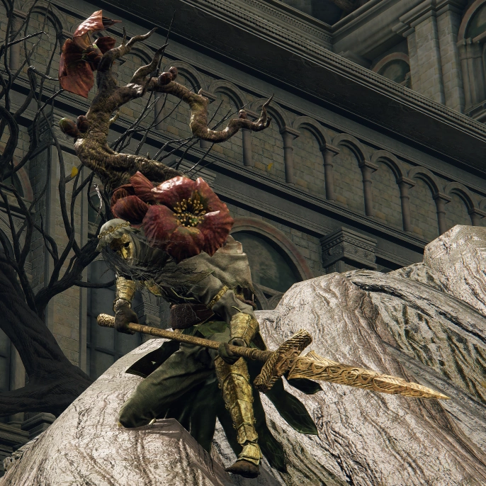 The masked guardians entered an ancient death pact with the Erdtree to be renewed with eternal life.[1] Armed with swordspears whittled from the hard wood of old trees, they were dextrous, expert protectors of Minor Erdtrees and the Erdtree itself at Leyndell, Royal Capital.[2] Budding branches grew from their backs, ready to release perfume and poisonous pollen. The blooming of their blood-red flowers was said to signal the impending end of their tenure, and the beginning of their transformation into trees.[3]