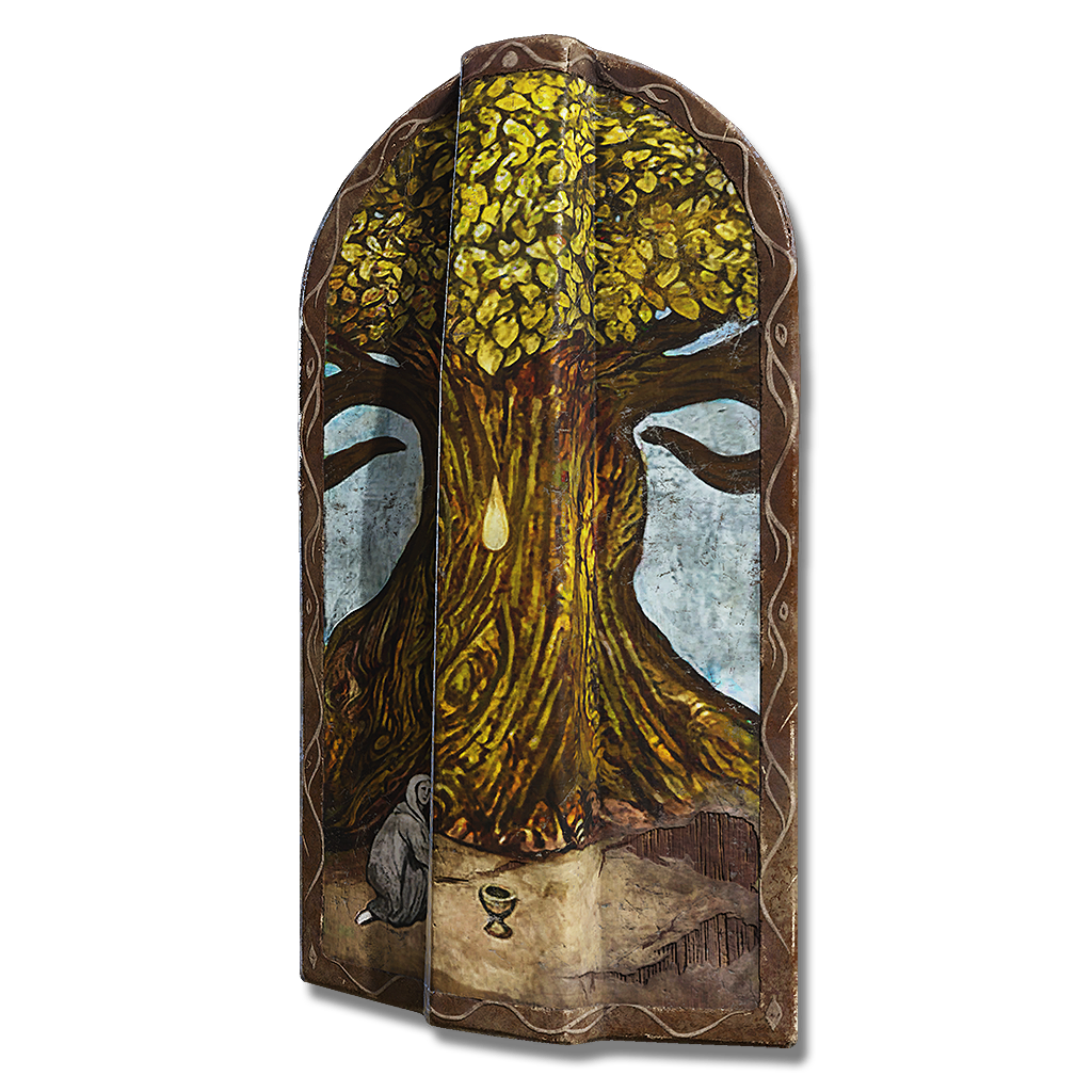 Greatshield painted with a divine scene; the recipience of a blessed tear from the Erdtree. An item that looks back fondly on the age of plenty.