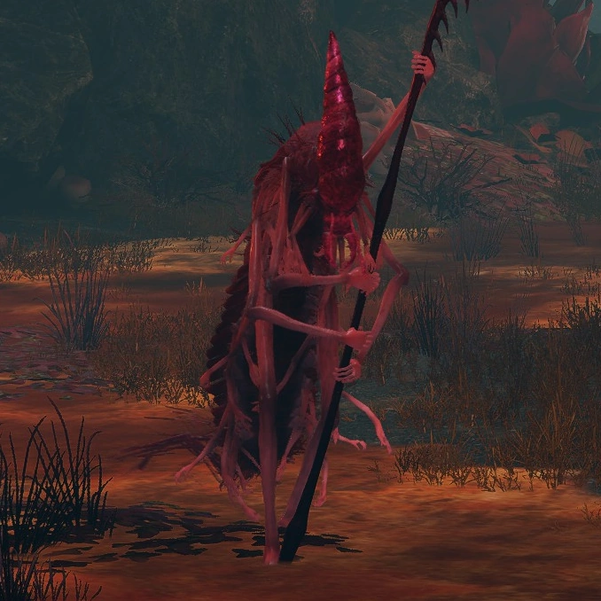 Fully-grown pests found in Rot-infested areas around the ancient Rauh Ruins and the Church of the Bud. They are colored pink to signify they have been embraced by Romina, Saint of the Bud. They wield glaives made from hard, sharpened shell, and can fire Pest Threads and Pest-Thread Spears from a distance. If Scarlet Rot or Poison is utilised near them, they receive a buff.