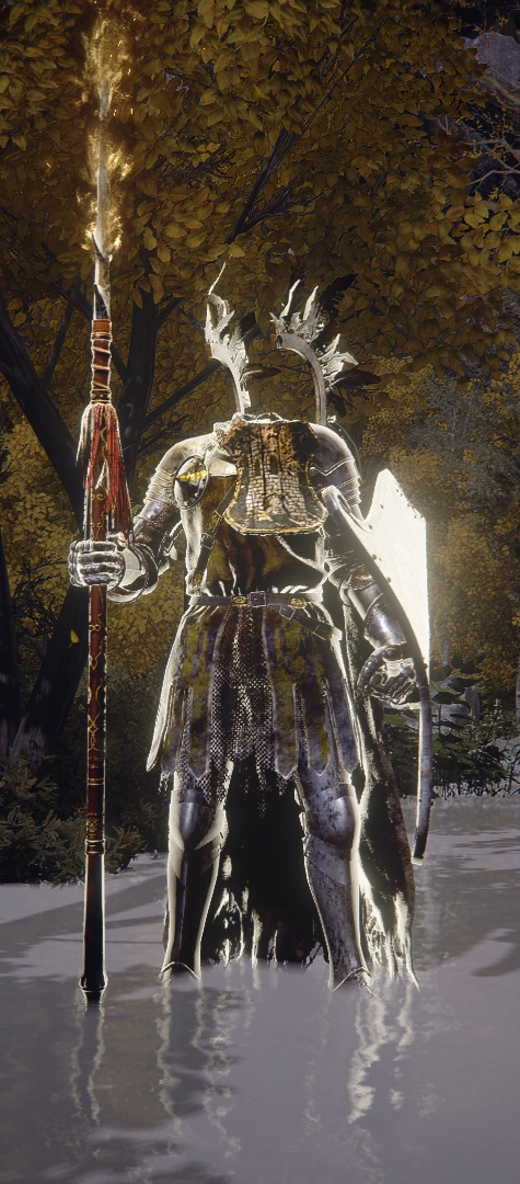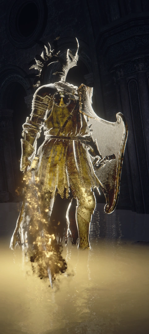 They wore wing-shaped ornaments on their backs to evoke the wicked Deathbirds of old[1][6]—offspring of the Twinbird who burned death in cold ghostflame to release vengeful spirits.[7][8] Their crested shields displayed the sun in eclipse, a star that protected the soulless by keeping Destined Death at bay.[9][10][11] They bore weapons enrobed in the Prince of Death's black-and-gold flame, inflicting Holy damage and Death Blight buildup,[12] and they hurled phantasmal spears.[13]