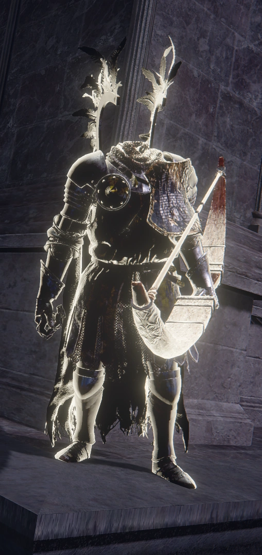 Armor worn by headless knights who endlessly guard the Wandering Mausoleum. The wing-shaped ornaments on its back evoke the Deathbird. A self-inflicted curse that ties the spirits of these loyal knights to the land, having willingly beheaded themselves so that they may serve their masters in death. |