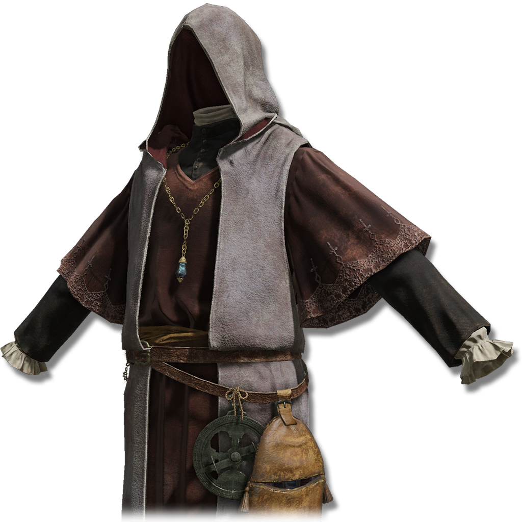 ↑ Nomadic Merchant's Finery : "Finery of the nomadic merchants. Decorated with tiny gems in a wide spectrum of colors. These merchants once thrived as the Great Caravan, but after being accused of heretical beliefs, their entire clan was rounded up and buried alive far underground. Then, they chanted a curse of despair, and summoned the flame of frenzy."