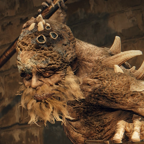 A Scaly Misbegotten bearing aspects of the primordial Crucible, Hewg practiced the once-divine art of smithing.[1][2] A spirit tuner with distinctive eyes helped him out in the distant past, though she died before he could repay her.[3]