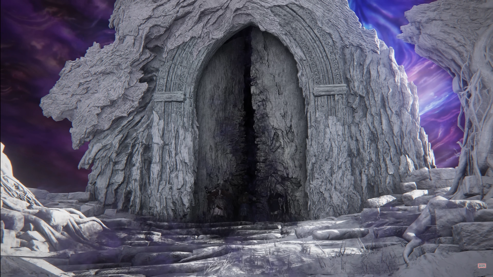 The interior of the divine tower closely resembles the other divine towers of the Lands Between but is entirely bleached white with roots coming down from its ceiling. There is a pool of blue water, a Site of Grace, a Smithing Table, and a petrified Merchant. A doorway leads to a bridge outside, where the sky is purple and chaotic. The bridge is structurally similar to those found at divine towers; however, its pedestals lack statues. At the opposite end of the bridge, a large gate is embedded within the trunk of a petrified tree.