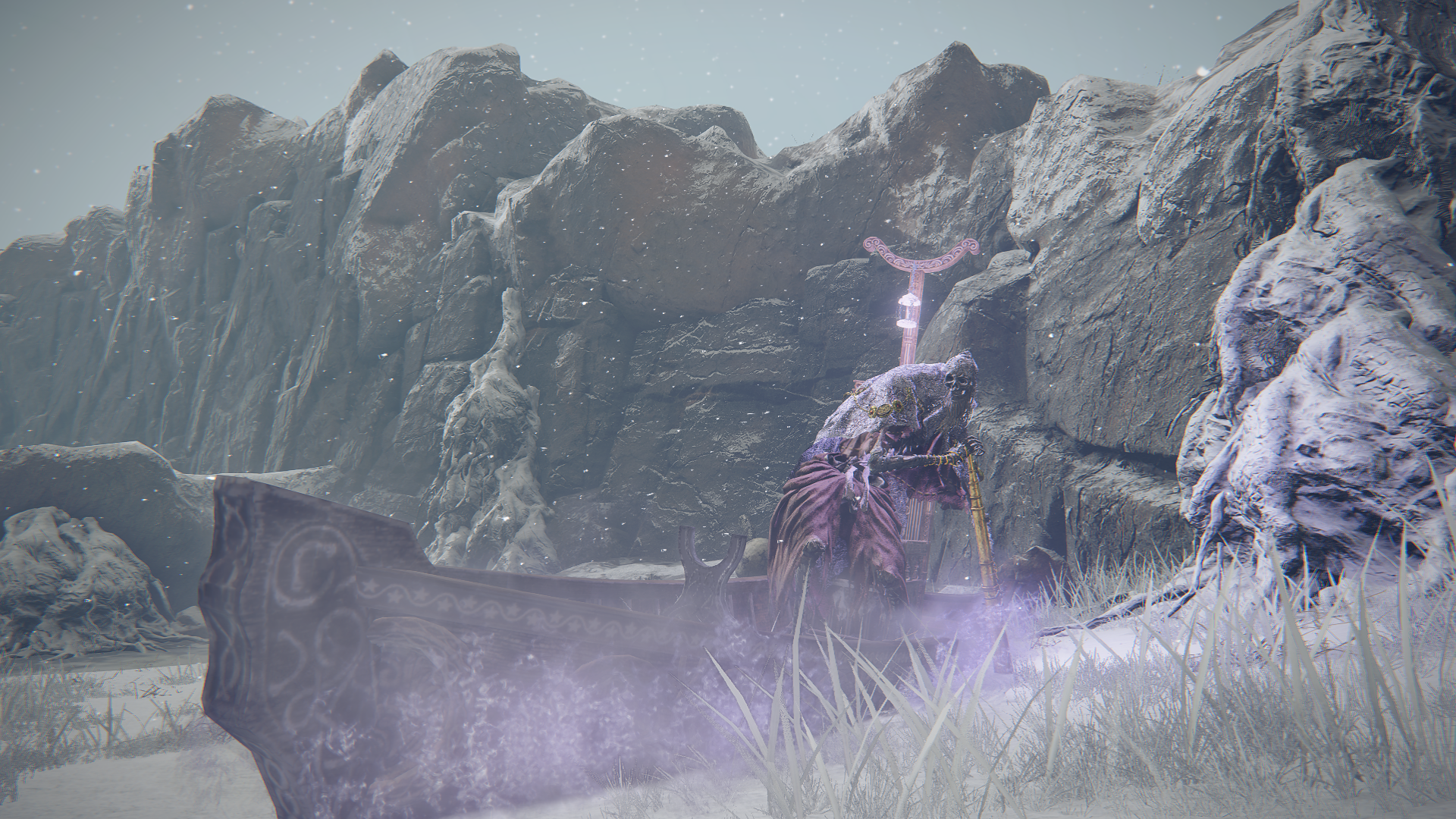 The mariner's transparent wooden rowboat shimmers with a faint purple hue. A chair is built into its deck, with a semi-circle cut into the backrest to create a depression at the top. Spiral patterns ascend its stile and backpost before transitioning into straight lines beaming upward. The backpost extends several feet higher than the chair and terminates in an upward concave arch reminiscent of Marika's Rune. Hanging ventrally from it is a small lantern alight with a purple ghostflame.[19] The boat's exterior hull is highly decorated with intricate relief carvings. Two adjacent floral embellishments are encircled by spiral-containing rings and bound together with a sturdy knot. The gunwale trim above features a wavelength weaving over and under stars, possibly symbolic of the Primeval Current.