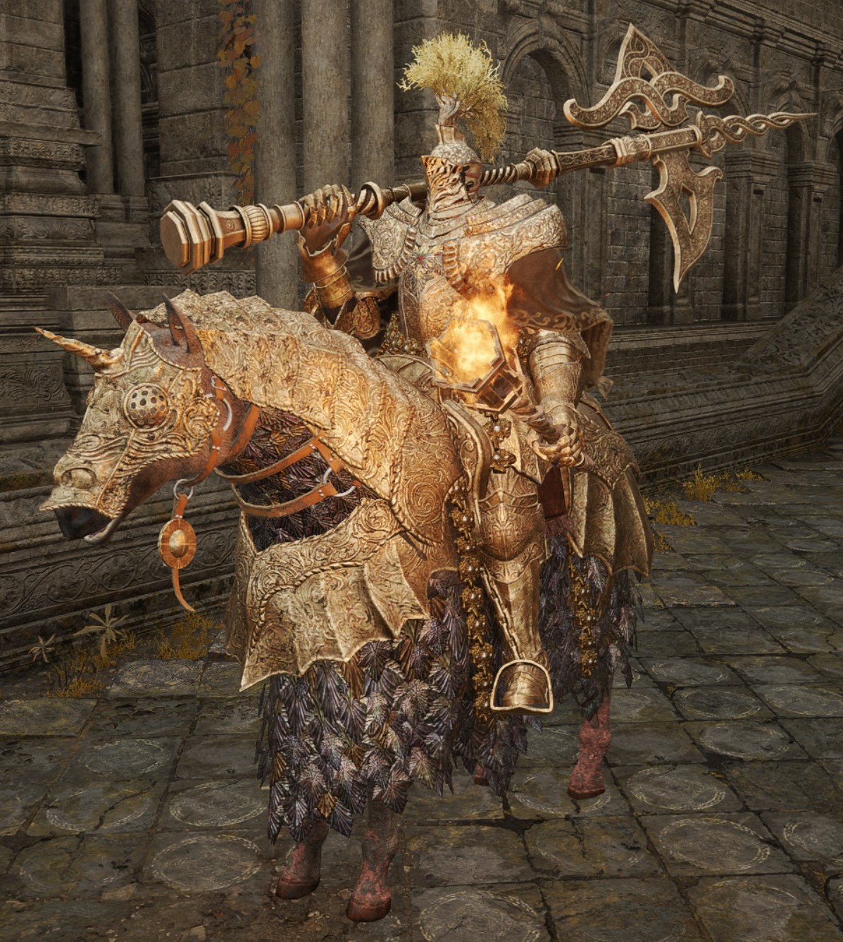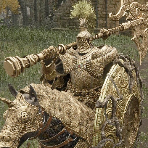 - Wields Golden Halberd and either Erdtree Greatshield or Sentry's Torch.