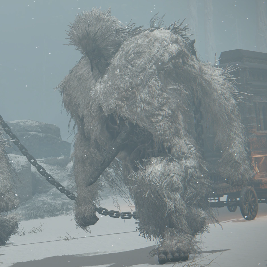 The Caravan Trolls are anchored to Great Coffins by enormous stakes driven through their torsos. They are often encountered in pairs, dragging their carriages across the Lands Between. They travel in loops around each above-ground region and are typically escorted by a detachment of Foot Soldiers and other warriors.