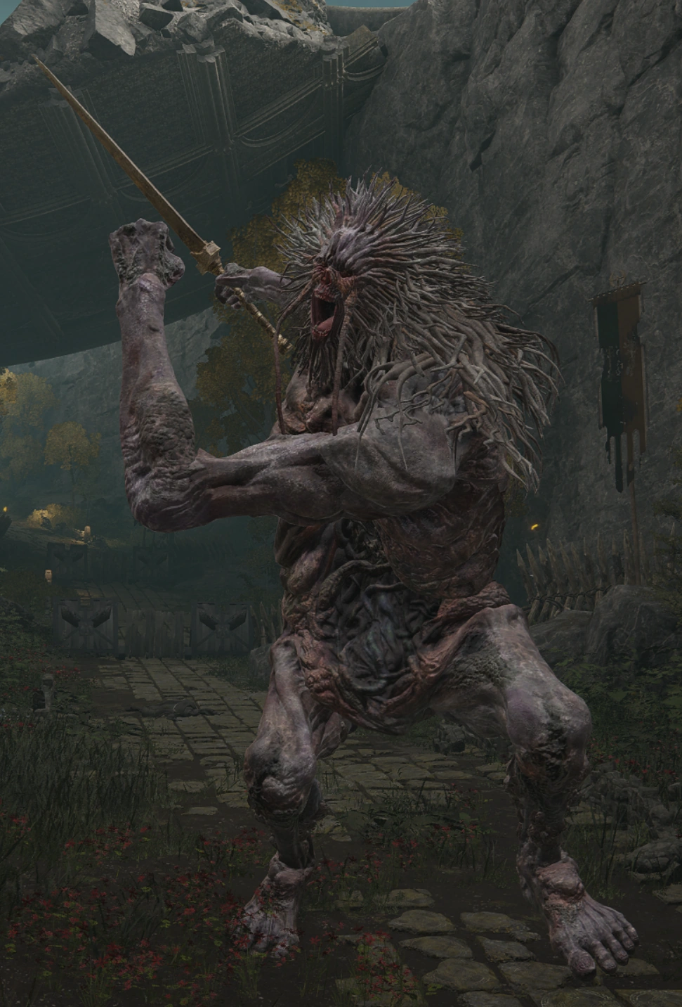 Trolls were an intelligent race of a lesser giants that inhabited the Lands Between, performing divine smithing rites with braided stone hammers.[1] Much smaller than their gargantuan progenitors, they betrayed the ancient Fire Giants during the War Against the Giants, tipping the scales in favor of Queen Marika's forces.[2][3] Those who fought for the Erdtree received swords gilded in gold, while those who fell were interred in the Giant-Conquering Hero's Grave.[4]