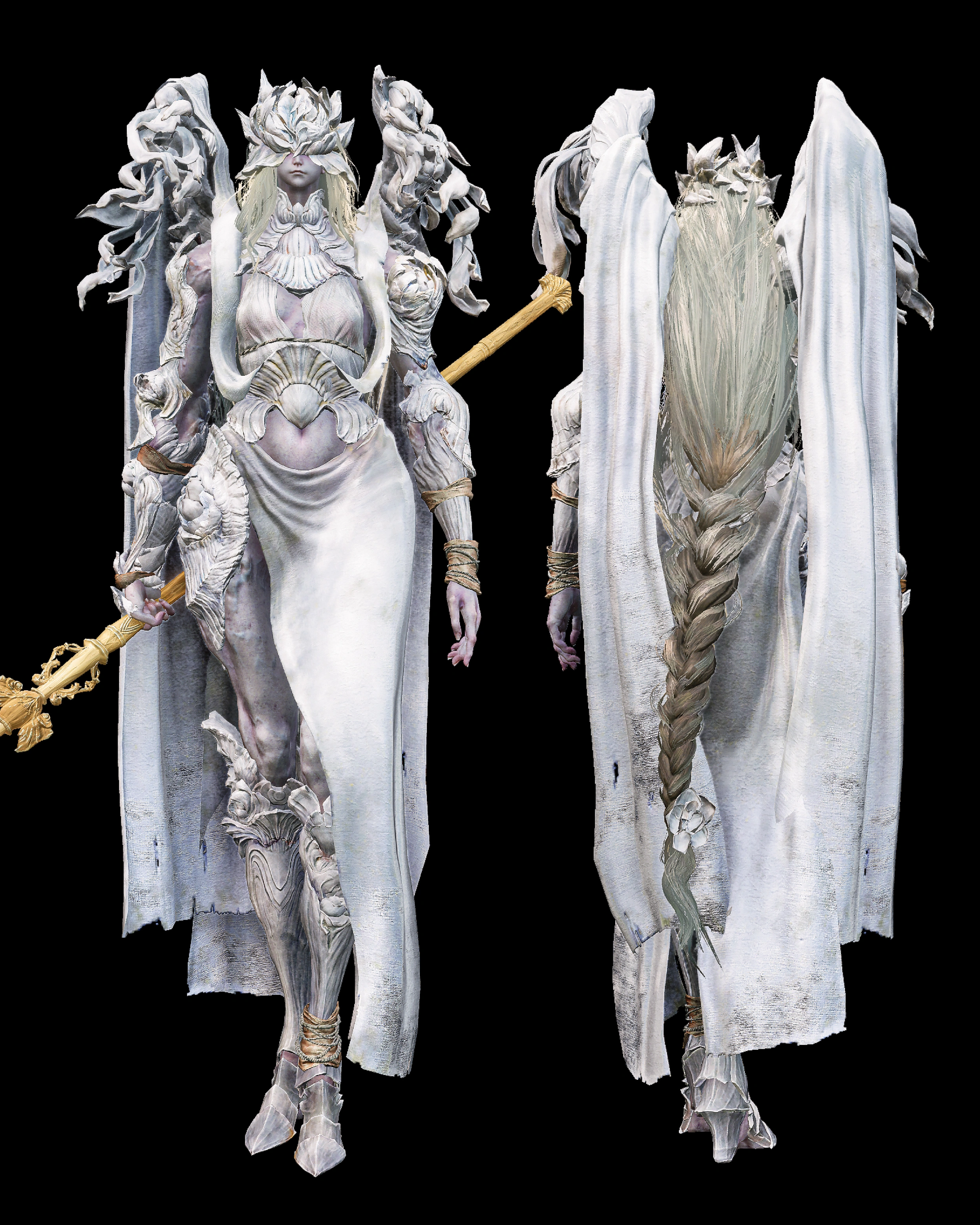 The Balancers are pallid maidens wielding victorious weapons. Their armor resembles white flowers. Their faces are similar to Trina's and have white clothes as wings.